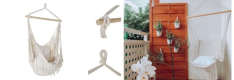 De QeChic hangstoelen voor in huis hebben metalen steunen of kettingen zodat de onderwerping meer zekerheid heeft. Degenen die erg op hangmatten lijken, hebben aan de uiteinden gevlochten touwen, zodat je ze in je favoriete kamers kunt hangen.